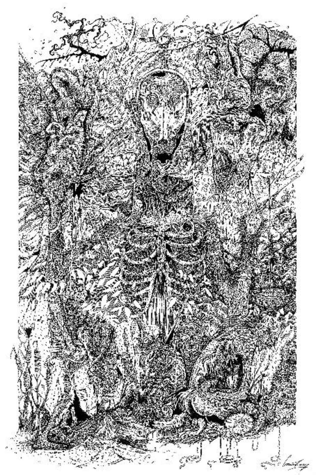 Ink is SPITE’s lifeblood, the fluid that boils forth from the UV drip. The medium through which their will speaks and needles are directed. They study beneath giants, those that have informed their work greatly, from Bernie Wrightson to Ian Miller and Virgil Finlay. Literary influences include Joseph Campbell, Samuel Beckett and Clark Ashton Smith.